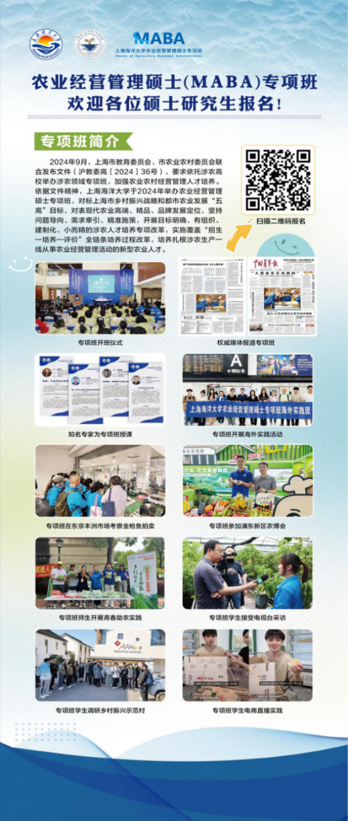 2024年9月,市教育委员会、市农业农村委员会联合发布文件(沪教委高[2024]36号),要求依托涉农高校举办涉农领域专项班,加强农业农村经营管理人才培养。依据文件精神,上海海洋大学于2024年举办农业经营管理硕士专项班,对标上海市乡村振兴战略和都市农业发展“五高”目标以及现代农业高端、精品品牌发展定位,坚持问题导向、需求牵引、精准施策,开展目标明确、有组织、建制化、小而精的涉农人才培养专项改革,实施覆盖“招生—培养—评价”全链条培养过程改革,培养扎根涉农生产一线从事农业经营管理活动的新型农业人才。