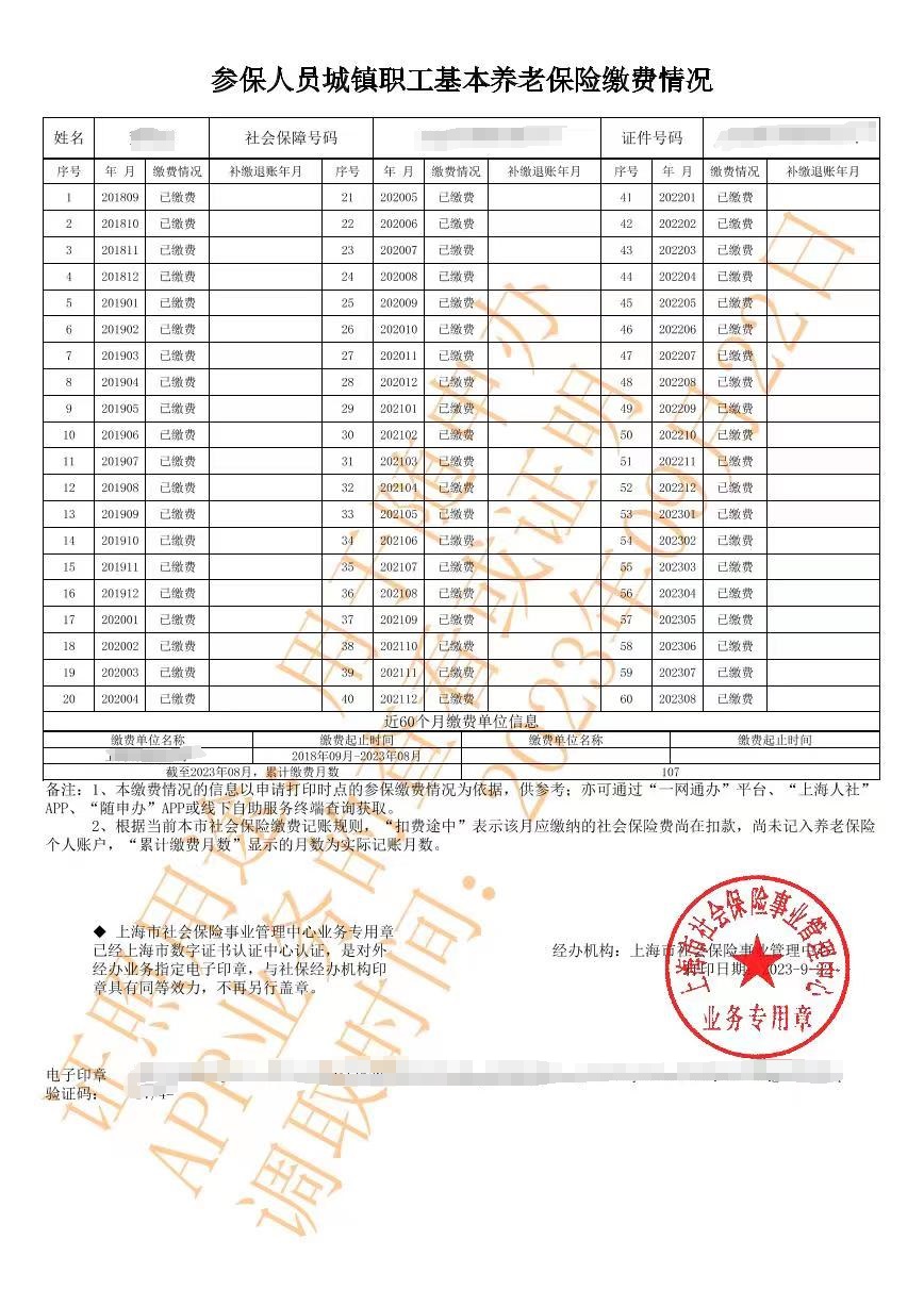 6.非沪户籍往届上海考生,须提供本人2025年连续6个月的上海社保缴费成功记录(2025届毕业生需提供本人2025年网上确认前连续3个月的上海社保记录),需至社保网点打印或通过“随申办市民云”APP、“随申办”微信小程序、“上海人社”APP、“一网通办”平台打印本人的《参保人员城镇职工基本养老保险缴费情况》(缴费情况为:已缴费),样张如附件5;